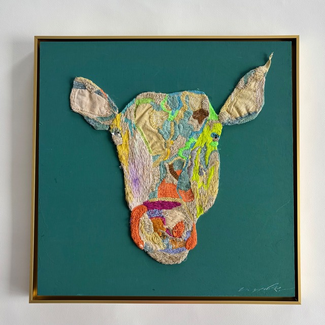 まるで森の中で静かに息づくような 優しい牛の肖像。 アップサイクルした布と草木染めの糸も使い、ひと針ひと針ていねいに刺繍しました。 色とりどりのステッチが重なり合い、命のぬくもりと自然の息吹を感じられる一枚です。 背景の深いグリーンが、刺繍の鮮やかさを引き立て、インテリアの主役になるような存在感を放ちます。 リビングや玄関、カフェスペースにもぴったりなアート作品です。 • サイズ:額込み 約43.0cm × 43.0cm(刺繍部分約32.0×32.0親切) •手刺繍.木製パネル.アクリル絵の具 額縁あり/ゴールド縁 • 作品一点もの