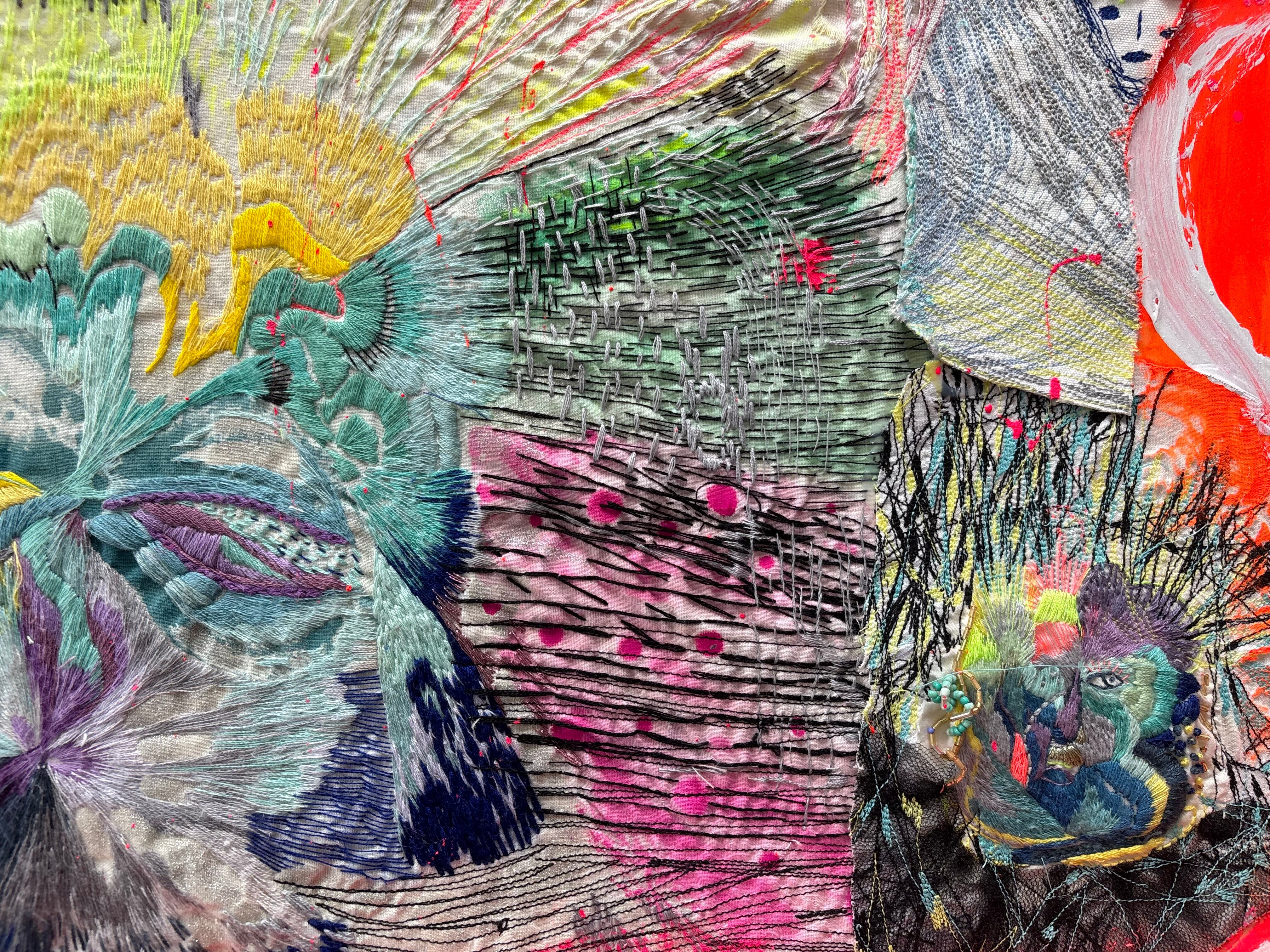 布地に施した緻密なステッチと、ペイントの大胆なタッチが重なり合い、まるで生命がうごめくようなうねりと躍動感を表現しています。
