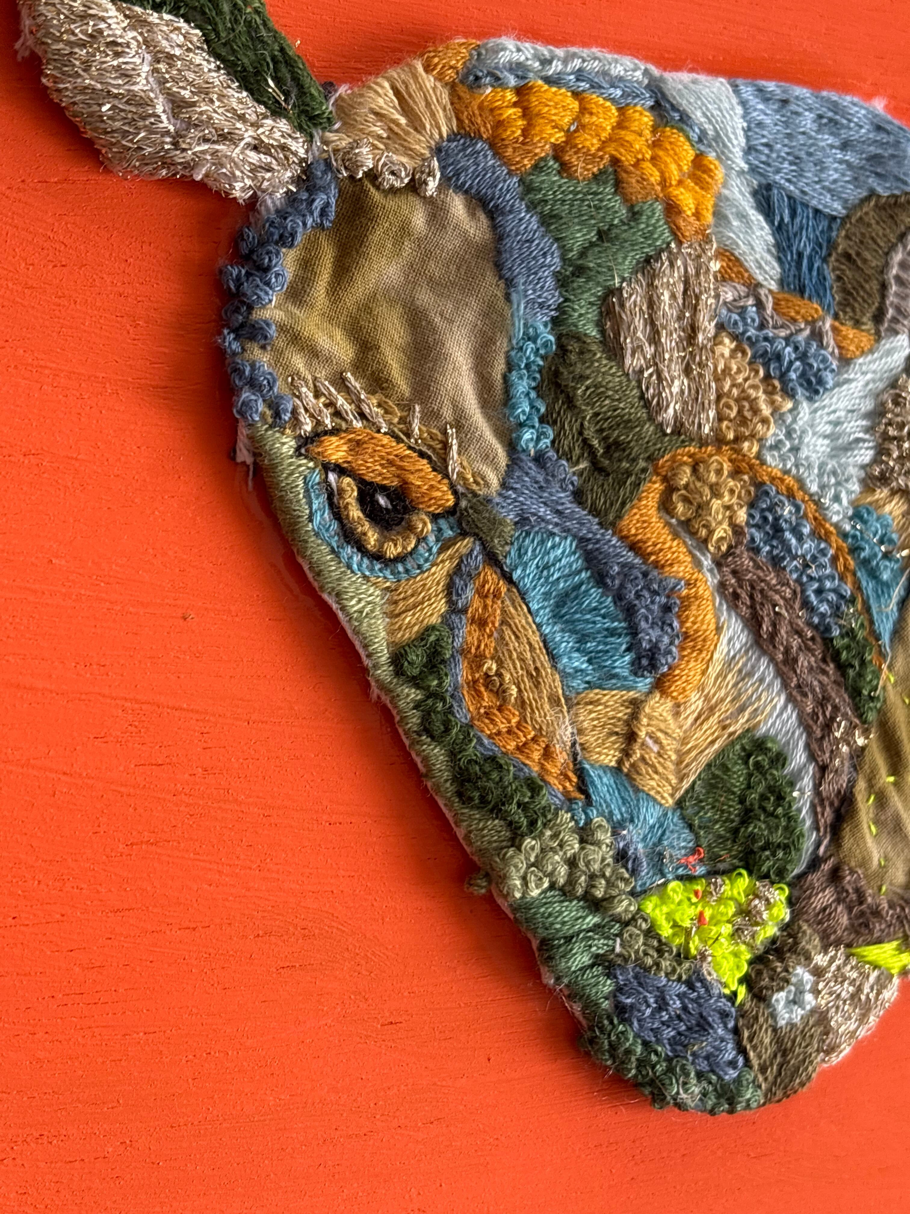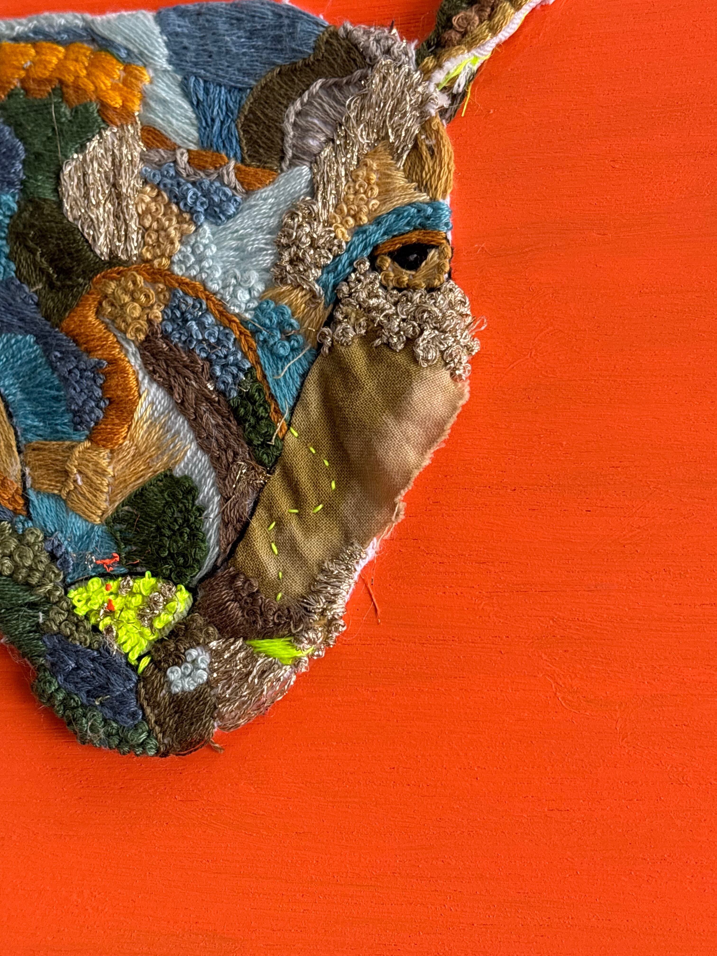 自然の色と形をひと針ひと針で紡ぎ、静かにこちらを見つめるような動物のまなざしを表現しました。