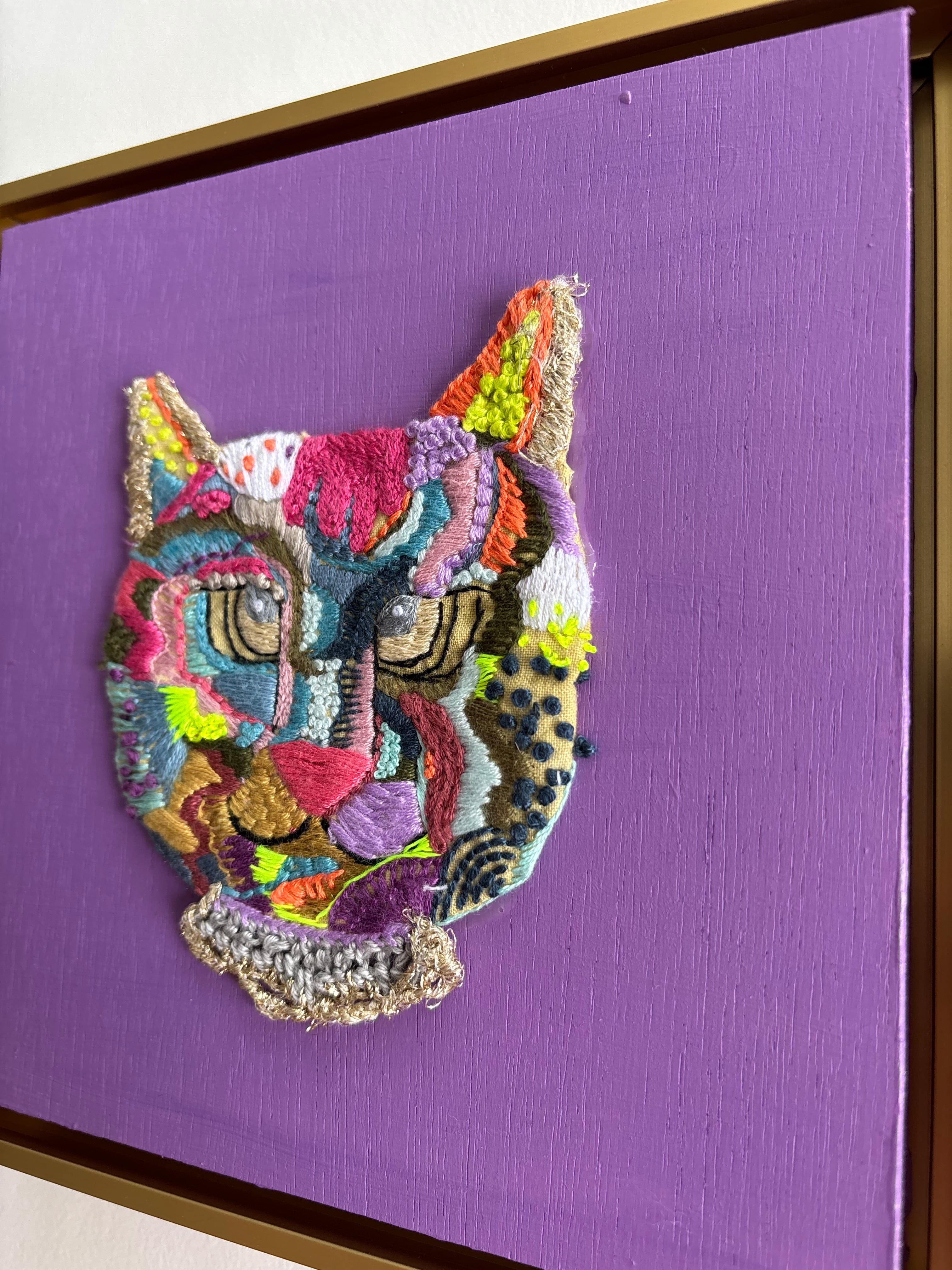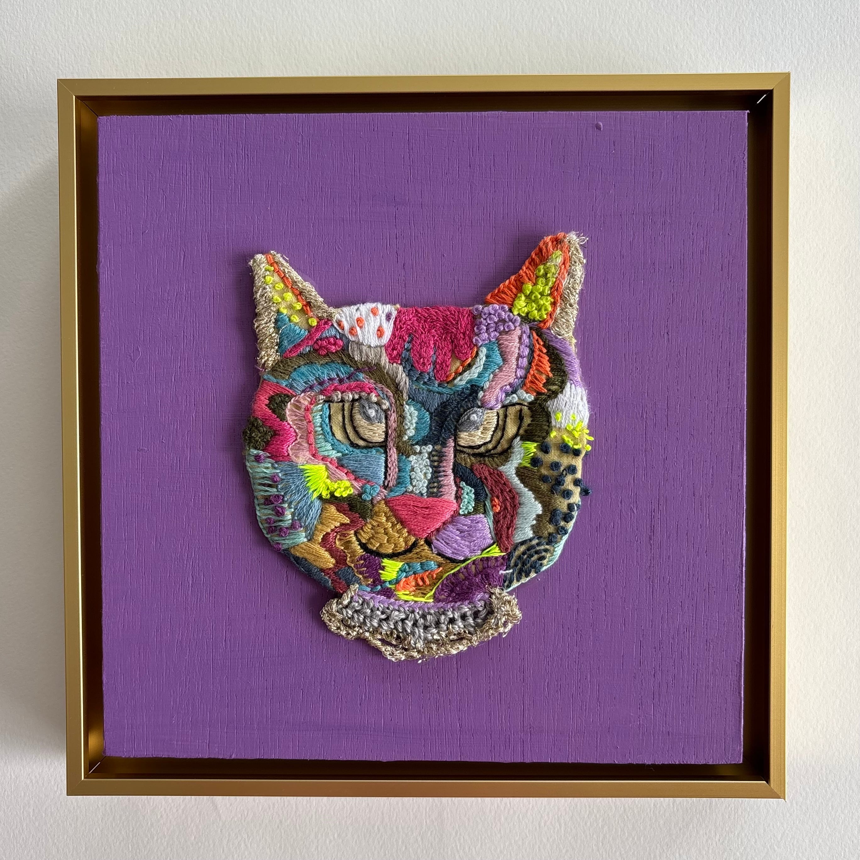深く澄んだ目、重なり合う色と糸のレイヤーは、自然界のエネルギーと野生の生命力を象徴しています。